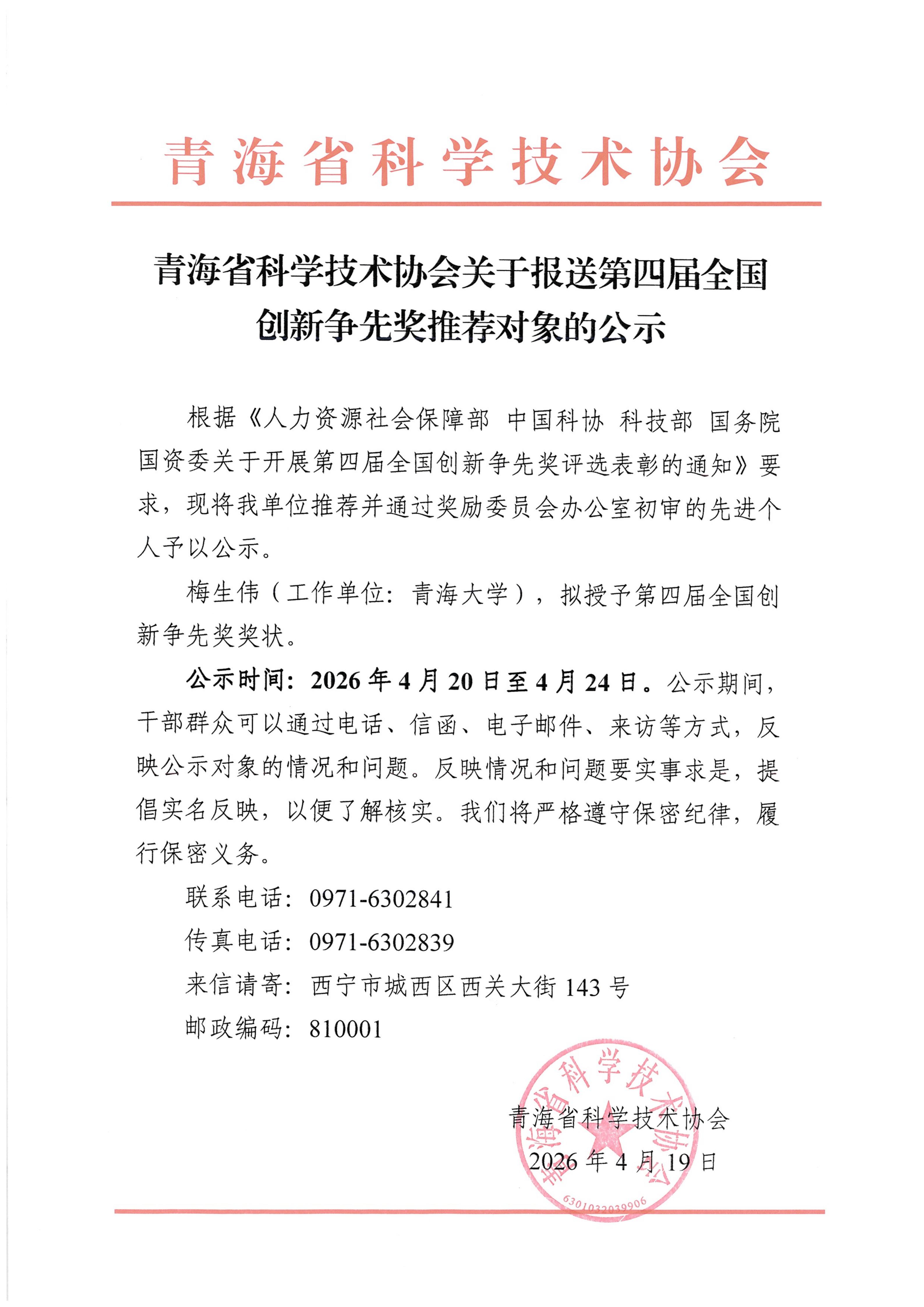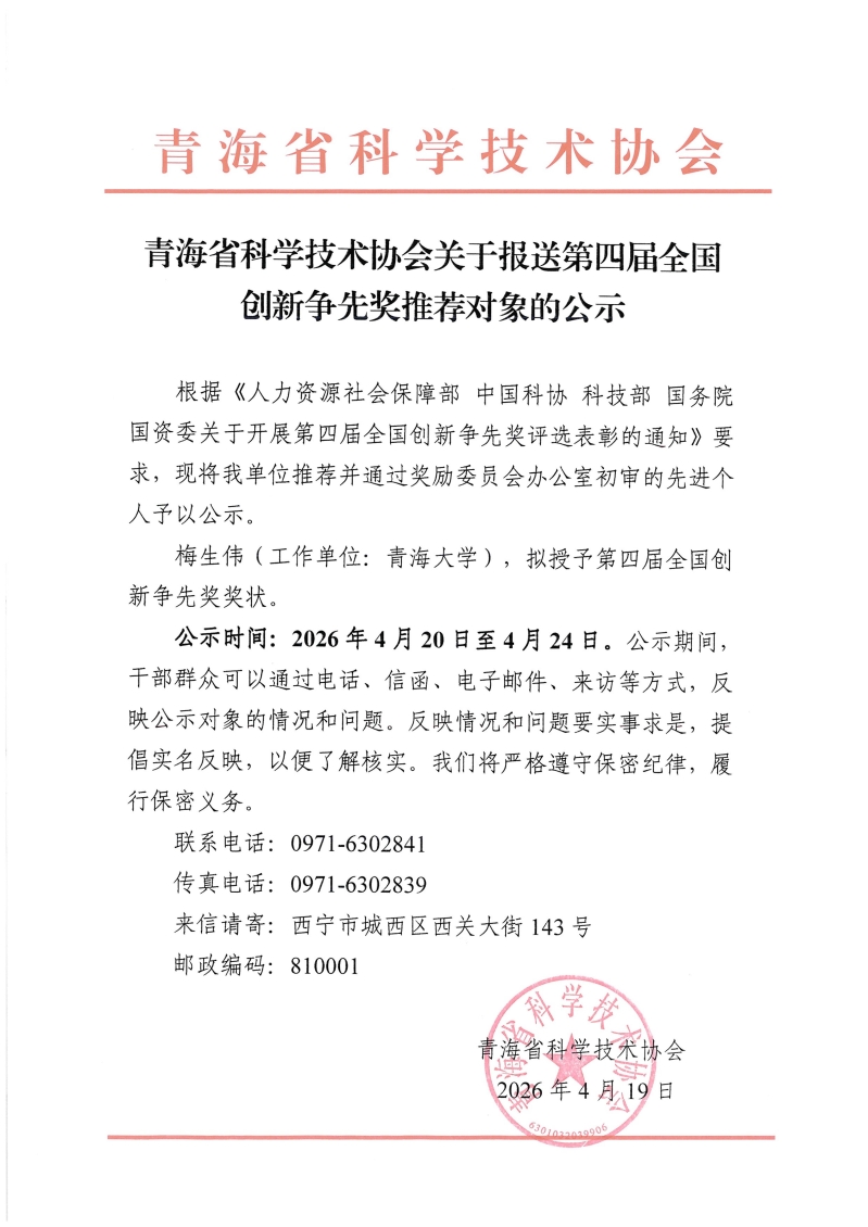 青海省科学技术协会关于报送第四届全国创新争先奖推荐对象的公示